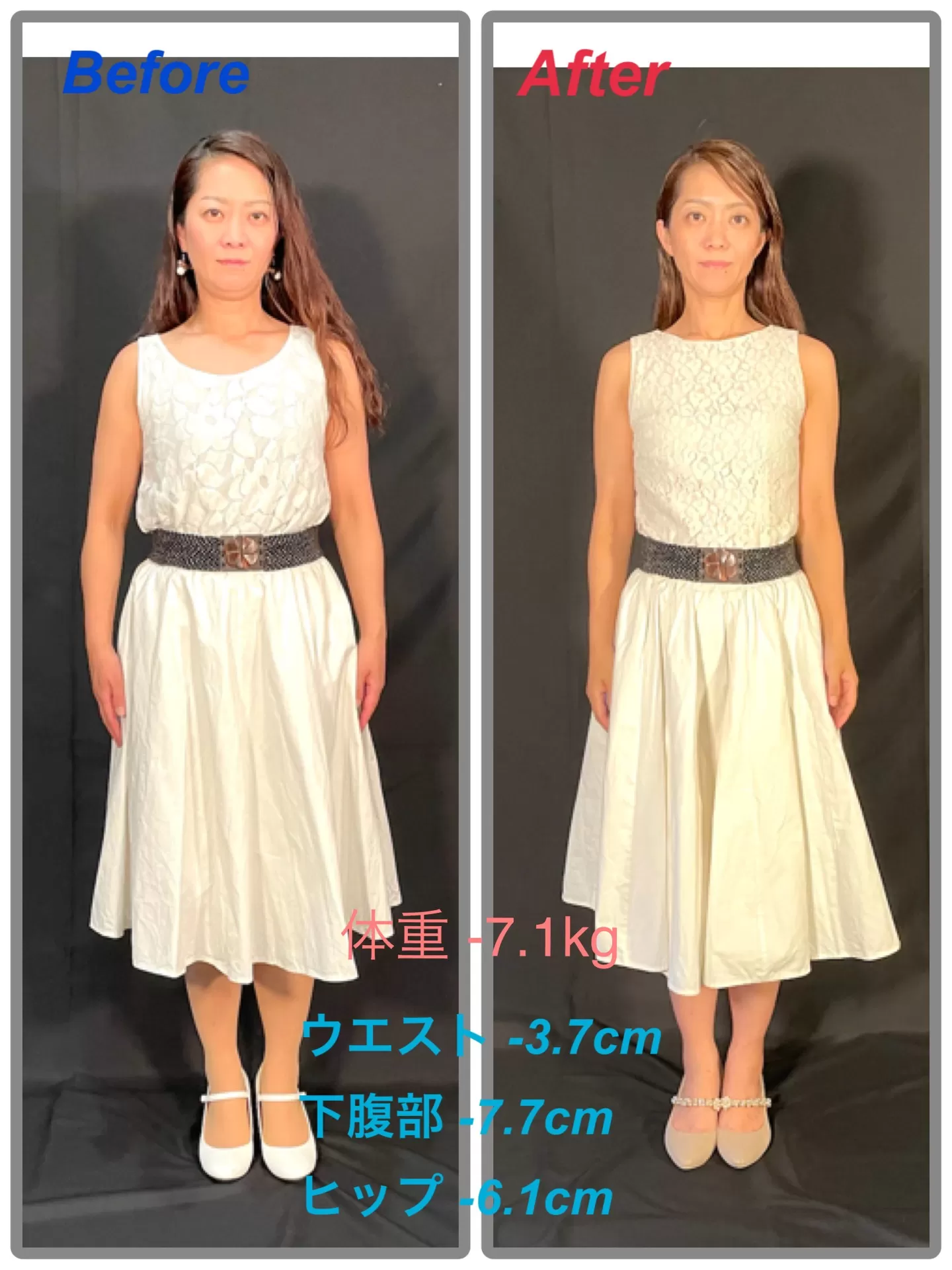結果は、お2人とも体重 -6.5kg以上、ウエスト・下腹部・ヒップ全てでサイズダウンを達成しました。